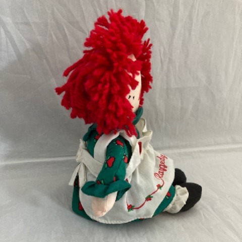 アンティーク ラガディ SNOWDEN ビーンズAnn 。スノーデン社。グリーンに赤いハート柄のお洋服を着た、とってもカワイイRaggedy Annです。お尻にビーンズが入っているので可愛く座ります。サイズ:20cm