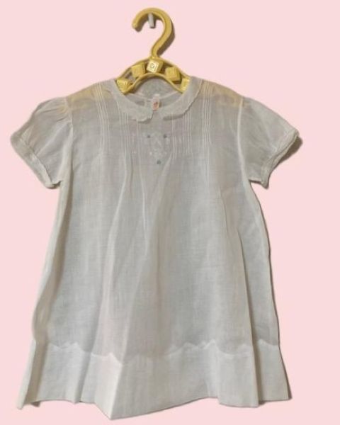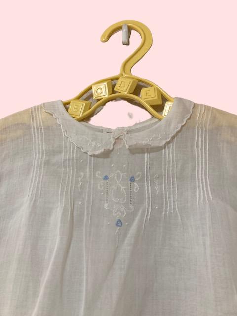 アンティーク べビードレスホワイト ブルー三カ所刺繍。胸元のところに、とても可愛いブルーの刺繍がされています。とっても可愛くてオシャレなベビーアンティークドレスです。黄色の可愛いプラスティックハンガー付