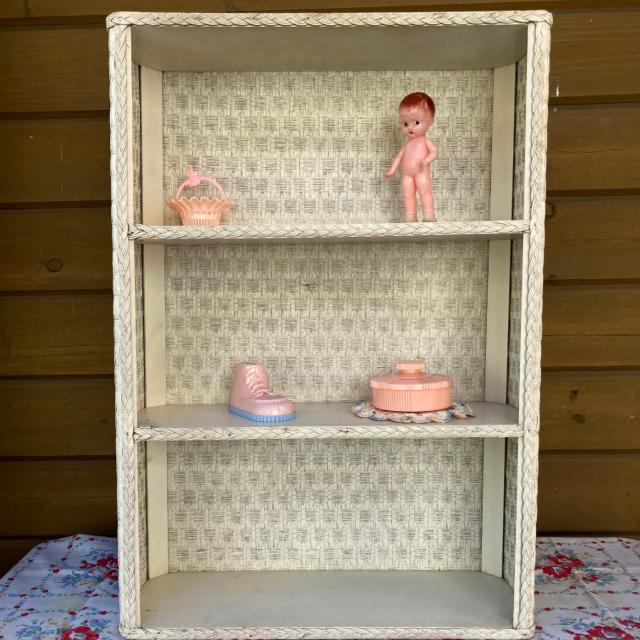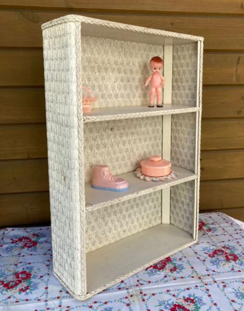 アンティーク ウィッカー3段ディスプレイラック、飾り棚。 コーナーやフック付きなので壁掛けなど、お気に入りの 小物や雑貨のディスプレイ棚としてお部屋のインテリアに最適です。置いた場合は少し斜めになります。棚の補修がされています。経年によるダメージ、ヨゴレやキズ等ございます。飾ってある小物は別売です。サイズ:W47×D16×H67cm