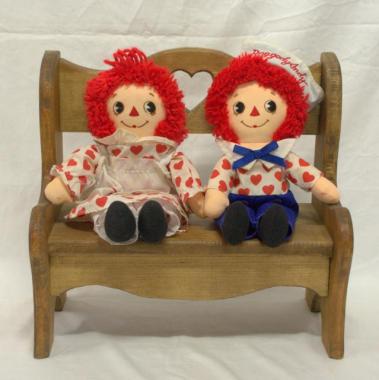RaggedyAnn&Andy、アプローズ社ラガディアン&アンディ バレンタインペア。可愛いハートで、おそろいの洋服を着たアンとアンディ。エプロンなど多少の汚れなどはありますが、顔など本体きれいです