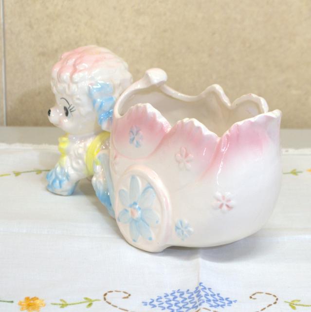 アンティーク ベビープランター仔羊 バギー、1950~60年代、輸出用に日本で作られたもので、アメリカで赤ちゃんが生まれた時にプレゼントに使われたものです。とってもかわいい、ピンクのバギーを引いた、仔羊のベビープランターです。割れ、欠け、ヒビは、ありません。サイズ:H10×D8,5×W22cm、素材:セラミック、日本製