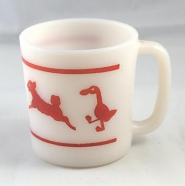ヘーゼルアトラス ファームアニマルマグ・レッド。1950年代アメリカ。 少し小さくつくられた、キディウェア子供向けのマグです。ヘーゼルアトラスのファームアニマルマグ。鶏、豚、ヤギ、アヒルのとてもシンプルな柄のファームアニマルがぐるりとプリントされていてとてもかわいいです。 刻印はありません。製造時の長い線の練ムラ、ホワイトラインがあります。ヤギの上、リム部に小さなチップがあります。直径7.5x高さ8cm