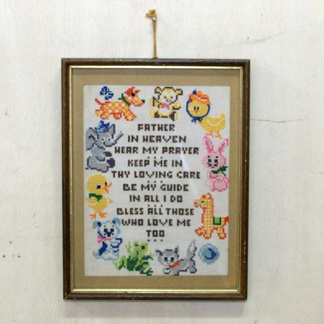 アンティーク エンブロイダーフレーム アニマル。アンティークのハンドメイド刺繍、可愛い動物たちが刺繍されています。木製の壁掛け、ガラス入りのフレームです。サイズ:w25×h32,5(吊り紐含まず)×d2cm