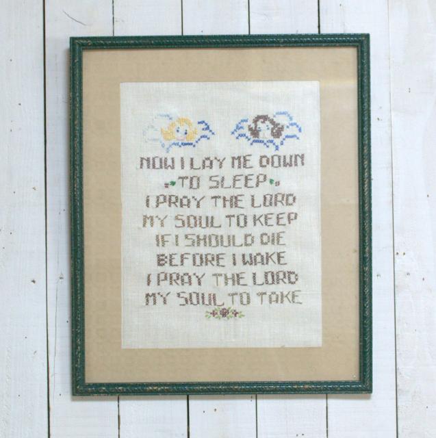 ヴィンテージ刺繍、額入り、とってもアメリカン カントリーなアンティークのハンドメイド壁掛け木製ガラスフレーム入り刺繍。経年劣化による刺繍、フレームのダメージなどがあります。サイズ:w38,5×h46,5×d1,2cm