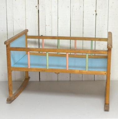 アンティーク ドールベッド,スイングベッドです。1950年代アメリカ。内側、外側に1ケ所づつ可愛いリボンとシューズの絵柄があります。お部屋やお店のインテリアとして、布やドール、小物などを飾ったら素敵ですね。経年による色ハゲ、傷や汚れがあります。片側の桟に穴(利用不明)があります。