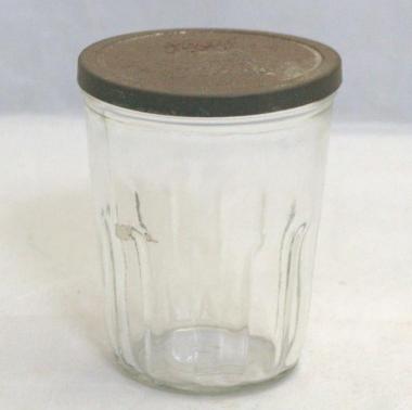 Ball Jelly Glass、Ball ボール社 ジェリーグラス ガラスジャー。1930-60年代アメリカ。ティン製のフタはエンボスロゴ入り、筆記体のロゴがいいですね、ぽってりとしたガラスと年月が作り出したティンの味わいがあります。ボトムに錬りムラがあり、フタは錆びています。小物入れなどに良いですね。直径T7,3×H9,3cm