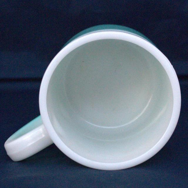 アンティーク ヘーゼルアトラス グラーデーションマグ(ブルー)1950年代頃、ヘーゼルアトラス社製、ミルキガラスにブルーのペイントで吹き付けされた人気のブルーのグラデーションマグ。底には刻印があります。割れ、欠け、はありません。サイズ:直径7.5xh8,5cm、耐熱ガラス、アメリカ製。