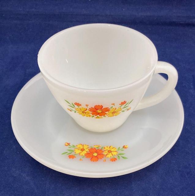 アンティーク ファイヤーキング プレミアム カップ&ソーサー パンジー。60年代に製造されていた、プレミアムシリーズのアイテム。オレンジと黄色のパンジーの花がかわいらしいカップ&ソーサーです。製造時からのホワイトスポット、練ムラが見られます。プリントはきれいです。サイズ:W11.8×H6×φ10(C) φ14.8(S)