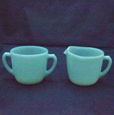 アンティーク ファイヤーキング TURQUOISE BLUE ターコイズブルー。シュガー&クリーマー1956~1958年のおよそ3年間だけ製造された希少性の高いターコイズブルーシリーズのシュガー&クリーマー。薄手なので、紅茶でもコーヒーでも中身が透ける感じがたくさん楽しめます。シュガー、口に小さなキズがあります。