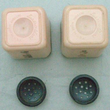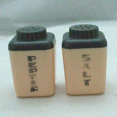 アンティーク、プラスチック製のスパイスボトルセット、ソルト&ペッパー、 Salt & Pepper Shakers。キッチンやテーブルのインテリアとしても良いですね、ビンテージ感たっぷりです。経年のキズや汚れが有ります。1940~60年代アメリカ。サイズ:振り出し口直径2,5、T3,8×3,8cm、B3,5x3,5cm