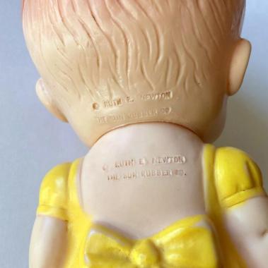 アンティーク サンラバーラバードール ガール イエローワンピース。アメリカ THE SUN RUBBER.CO RUTH E,NEWTON. 黄色のワンピースを着た、とっても人気のある、可愛いラバードールの女の子、顔にうすく汚れ,髪の毛,洋服に色抜けがあります。スクイークは、鳴ります。サイズ:h20,5cm