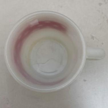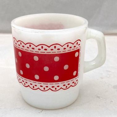 ファイヤーキング Fire King、レースドットRED、Picnicシリーズ。フリルと水玉模様の融合が素敵なマグカップです。ボトムに練りムラ(ヘアライン),ハンドルに劣化線があります。年代:1960~1976年代、サイズ:直径7,7×w10.3xh8.8cm、素材:耐熱ガラス、生産:アメリカ