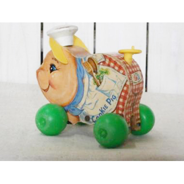 1965年フィッシャープライス社製、Cookie Pig、 タイヤを動かすとカチカチと音が鳴り、尻尾がクルクルまわります。多少のはがれなどもあり、オリジナルの紐はありません。