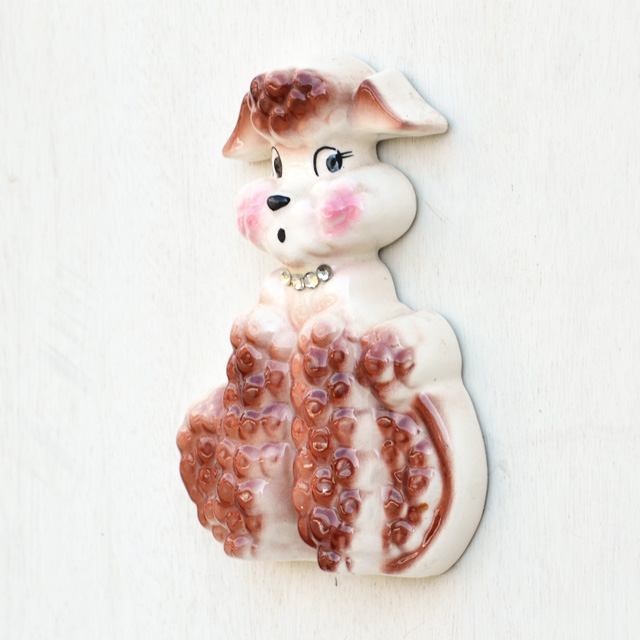 アンティーク プードル 陶器製壁飾り。お座りしたプードルと、立っているプードルのセットです。壁掛け用になっていますので、お部屋などのインテリアとして、とっても可愛いですね。サイズ:h14×w10.8×d2.7cm、h13×w13.5×d2.8cm